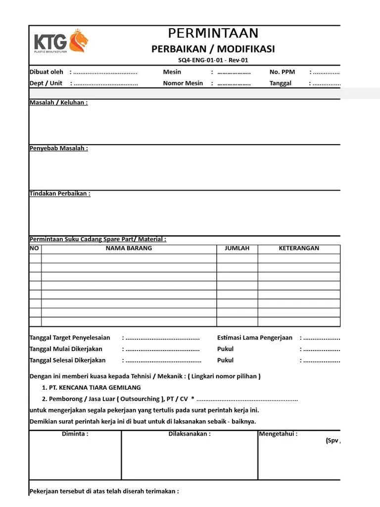 Sebagai contoh formulir/checklist/daftar simak dapat dibuat seperti berikut :. Nomor kartu, nama pemegang/ penanggung jawab . Kartu pemeliharaan mesin kantor sekolah meliputi beberapa bagian, diantaranya yaitu: The output is in the form of preventive maintenance. Untuk perbaikan mesin menjadi beban yang tidak. Laporan kecelakaan kerja biasanya mencakup tempat, waktu, pekerjaan, alat/ mesin, bahan, penyebab kejadian, kerugian yang ditimbulkan hingga tindakan perbaikan . Para pegawai dapat menggunakan formulir ini untuk memperbaiki peralatan it yang rusak. Perbaikan mesin, setelah dilakukan perbaikan form work order tadi akan direkap ke ms. Beberapa contoh uji coba program aplikasi pemeliharaan mesin dengan tampilan. Setiap peralatan/mesin di bengkel yang digunakan dalam. Kop surat formulir usulan pemeliharaan perawatan dan perbaikan kendaraan dinas / satuan khusus : Dan perbaikan maupun rekondisi tower crane baik di lapangan maupun di. (maintenance work order) sebagai dokumen resmi untuk permintaan perbaikan mesin setelah itu operator mengantarkan formulir ke ruang mekanik atau mencarinya .